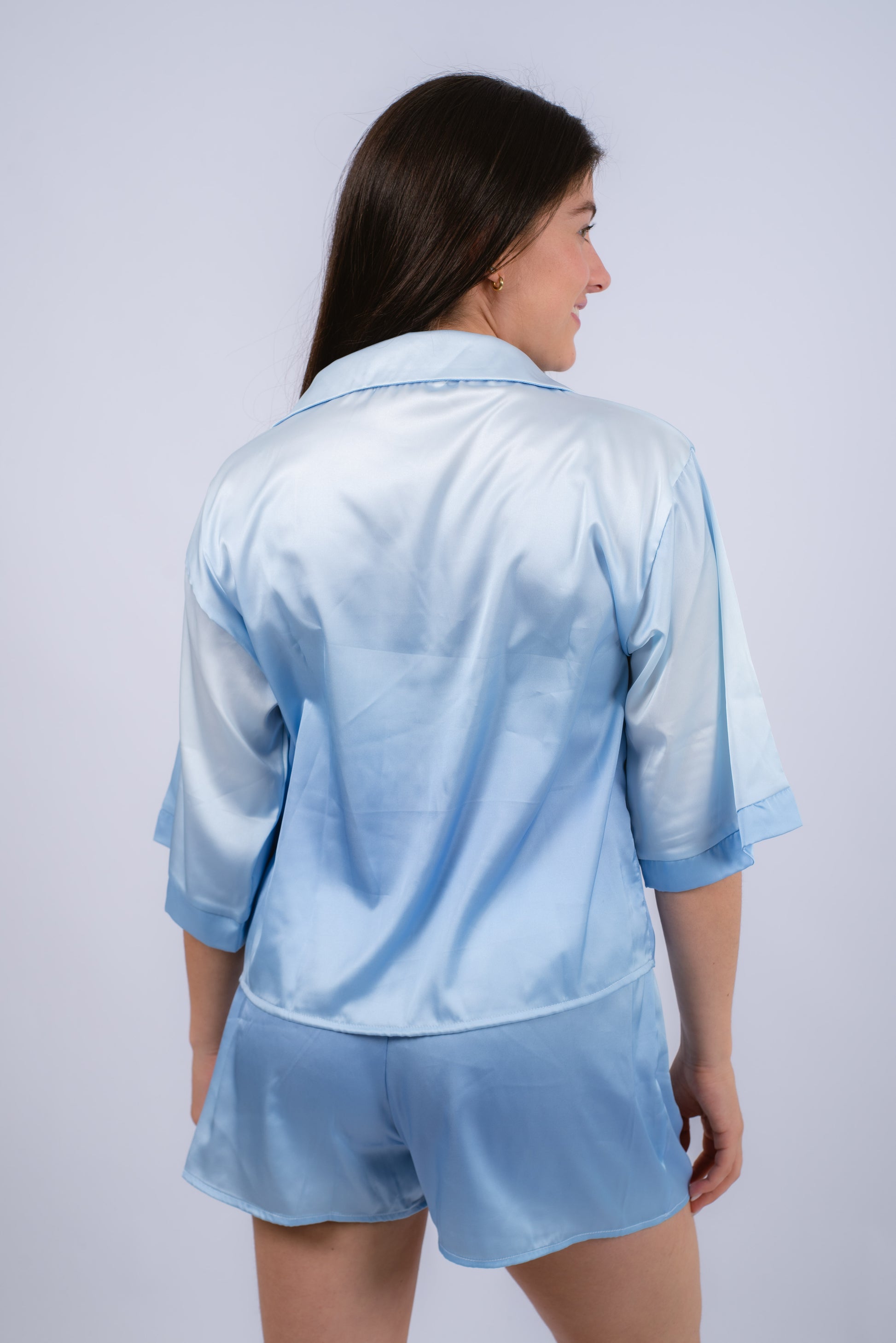 Un suave degradado en tonos celestes que transmite frescura y modernidad. Este conjunto de seda es la combinación perfecta entre delicadeza y estilo.