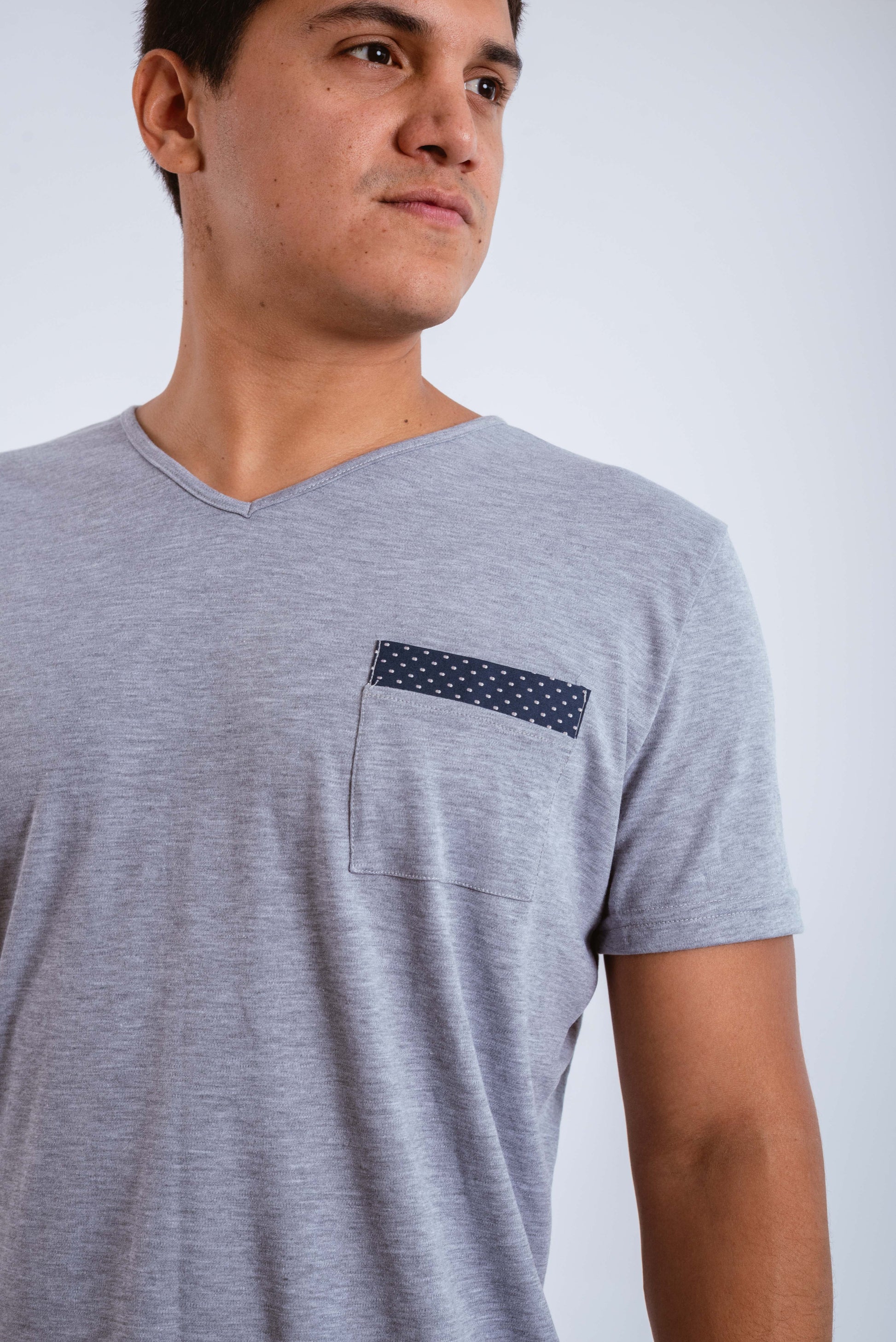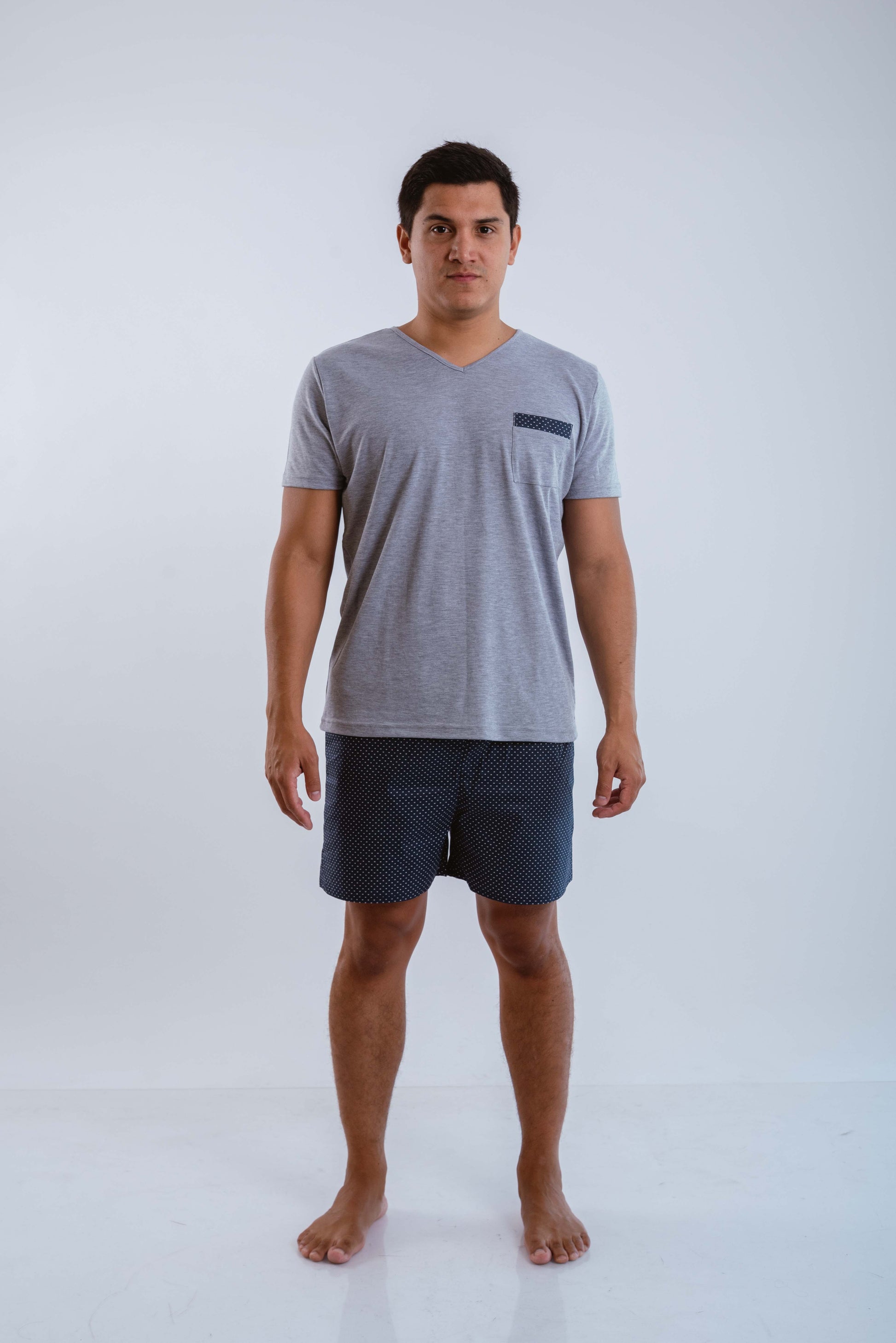 Frescura y confort en cada detalle. Este conjunto incluye un short de popelina de algodón azul, diseñado para brindar ligereza, y un polo de algodón pima gris, tan suave como elegante.