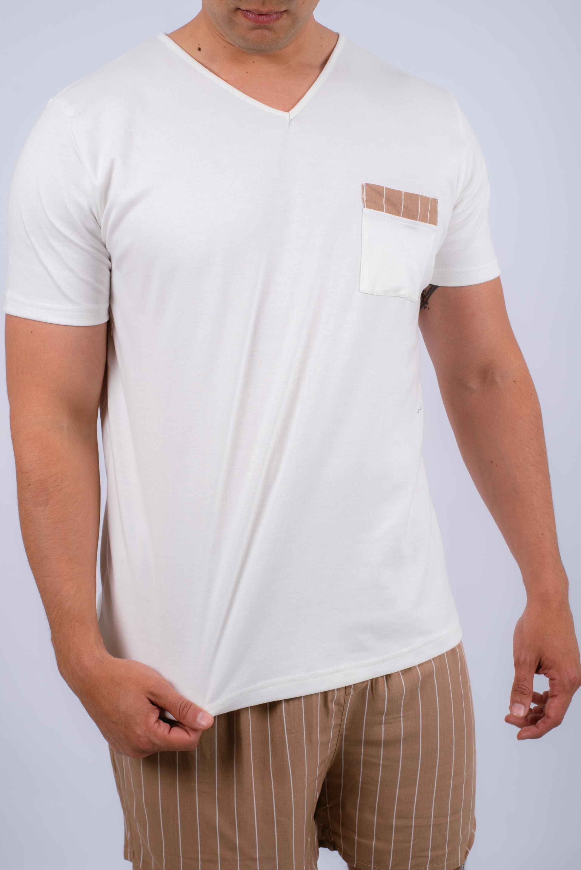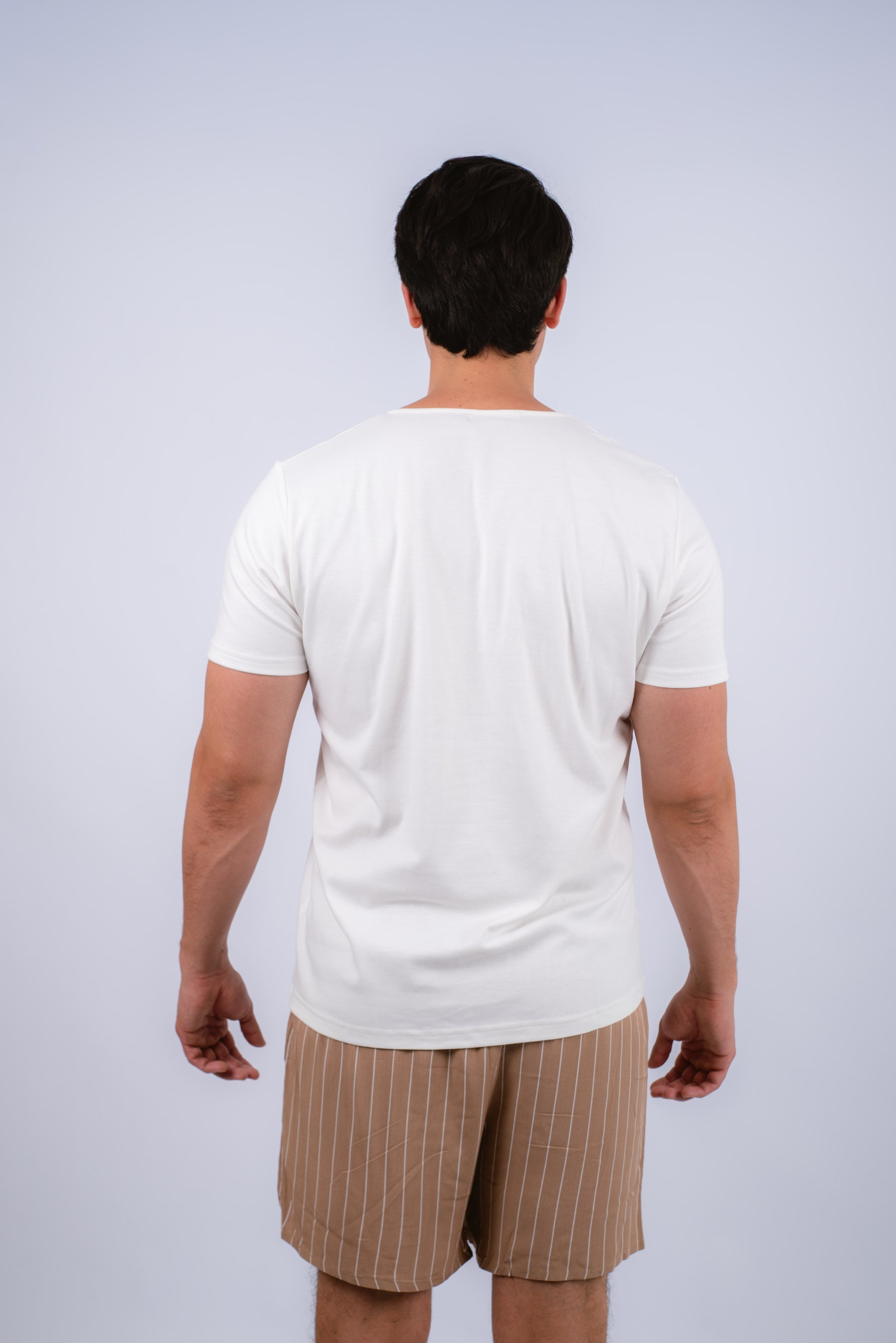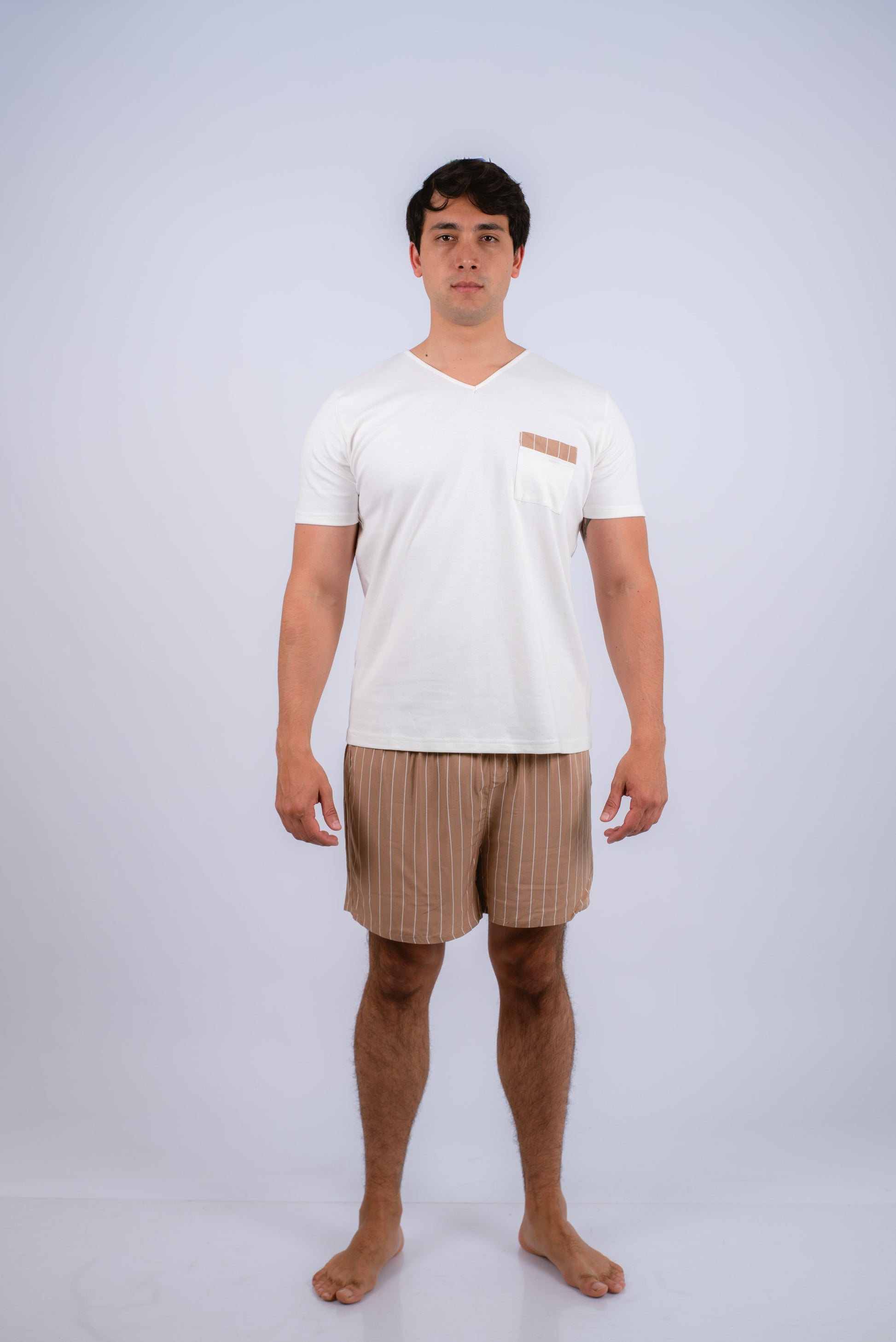 La elegancia está en los detalles. Polo blanco de algodón pima y short marrón de rayón, diseñados para brindar suavidad y ligereza. Perfecta para noches relajadas y mañanas llenas de estilo.
