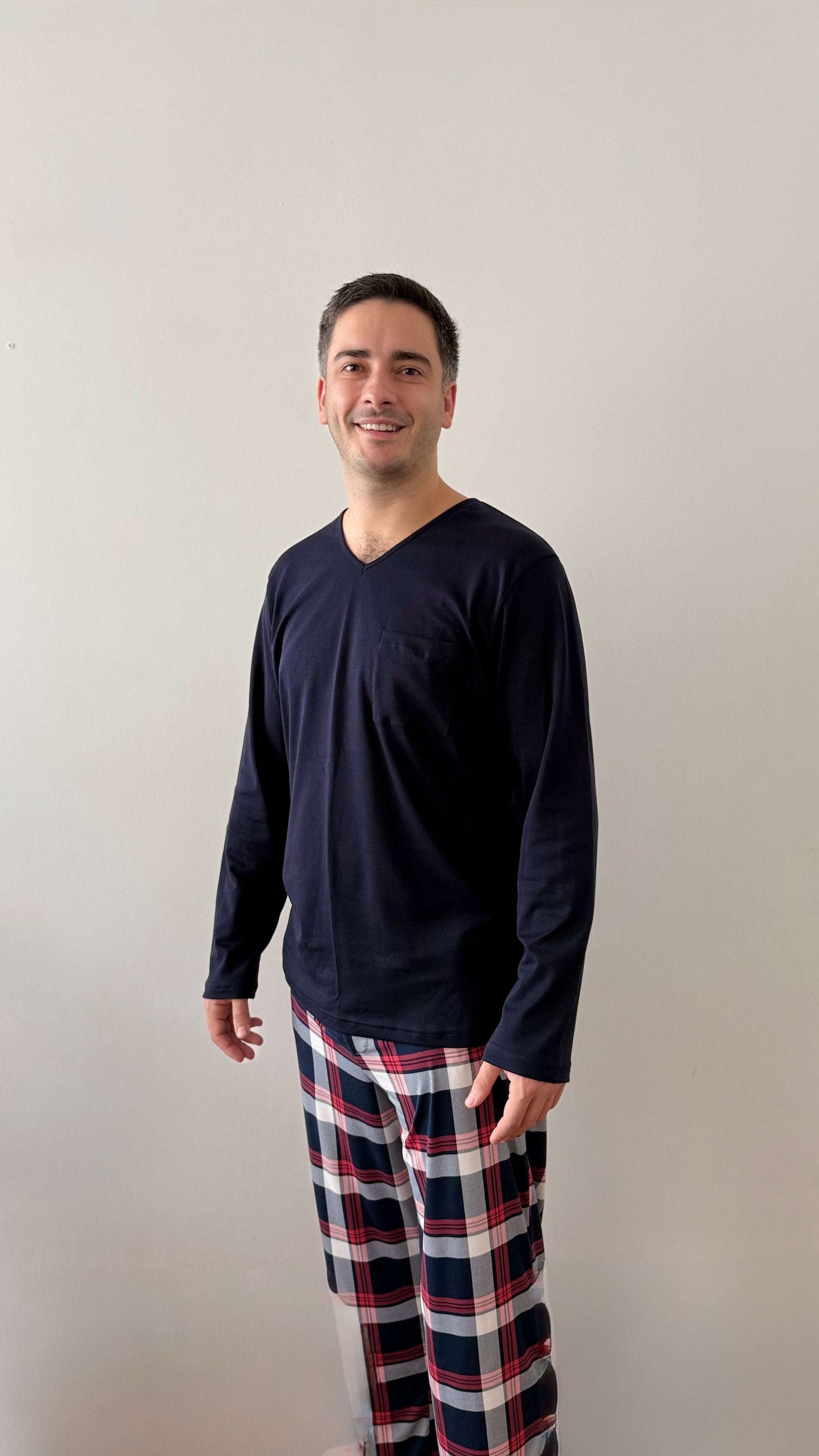 Una combinación de cuadros en tonos azules y guindas que transmite frescura y modernidad. Ideal para quienes prefieren un estilo relajado pero con personalidad.