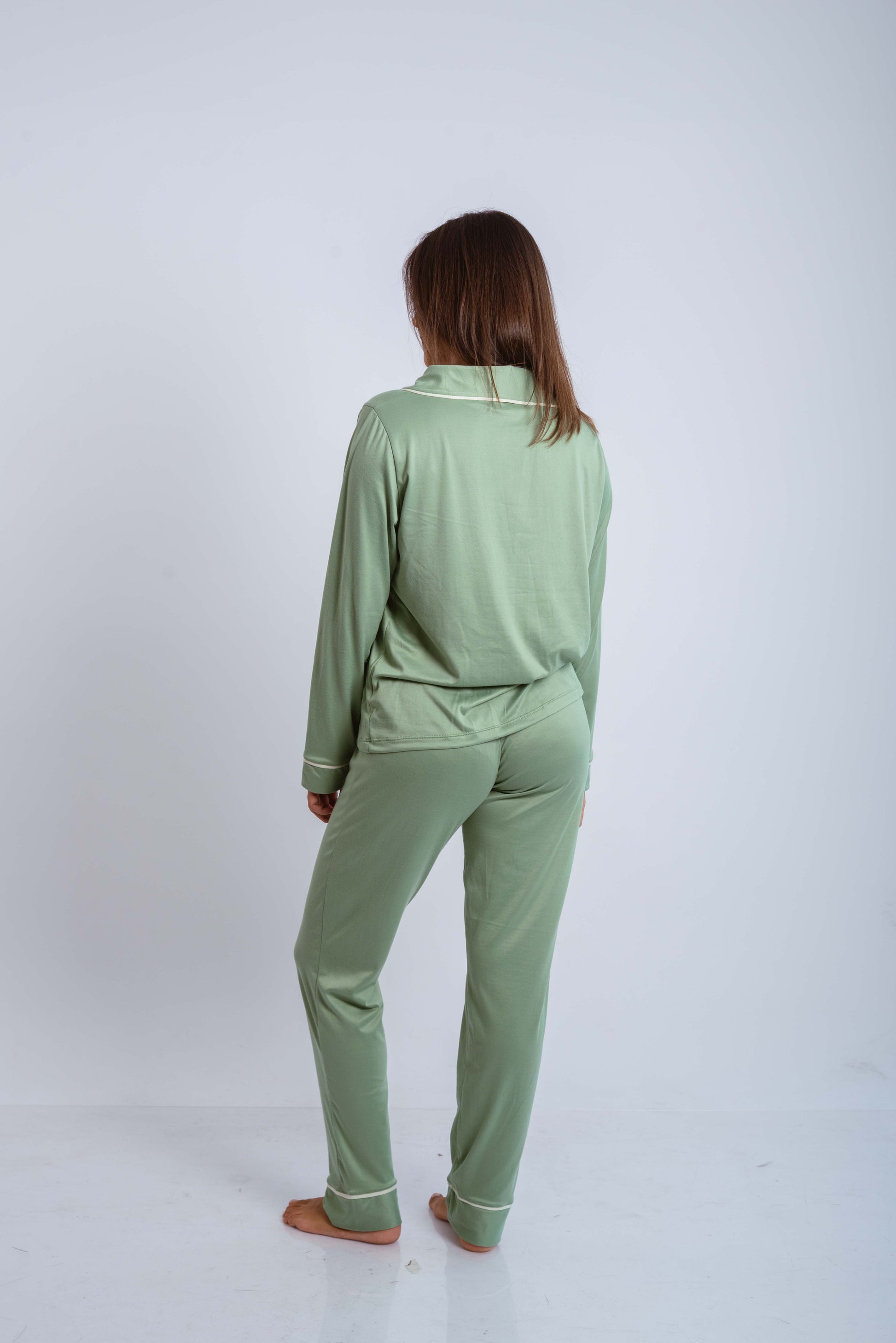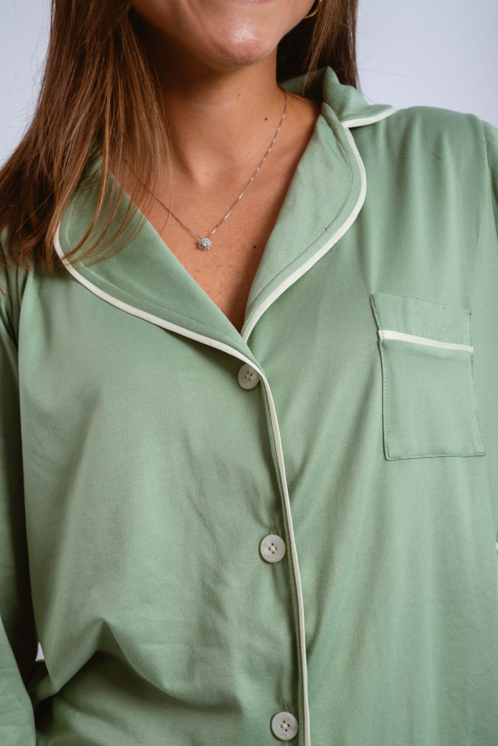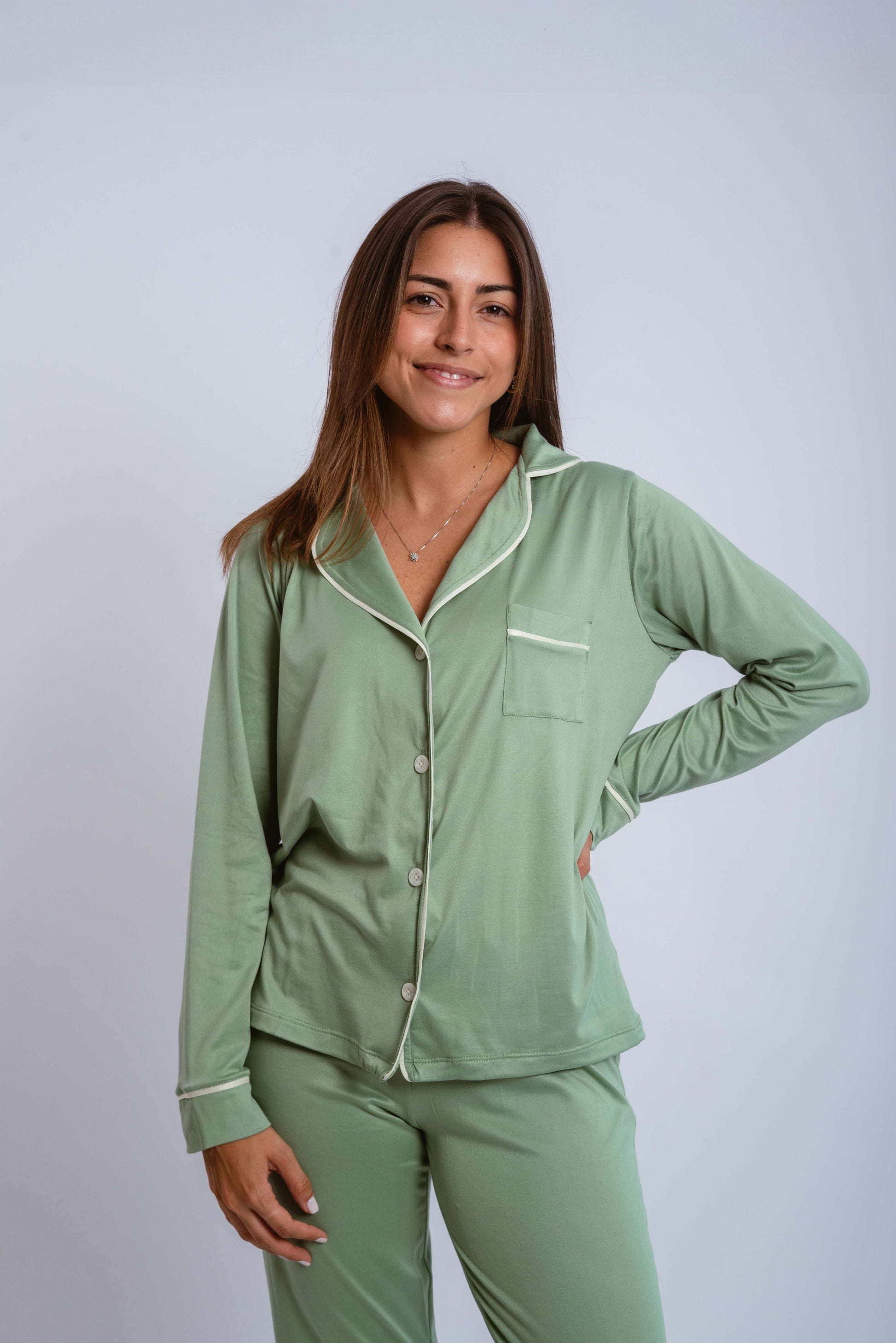 Inspirada en el verde pistacho, esta pijama evoca la calma de la naturaleza y la suavidad de una infusión cálida. Liviana, delicada y sutilmente refrescante.